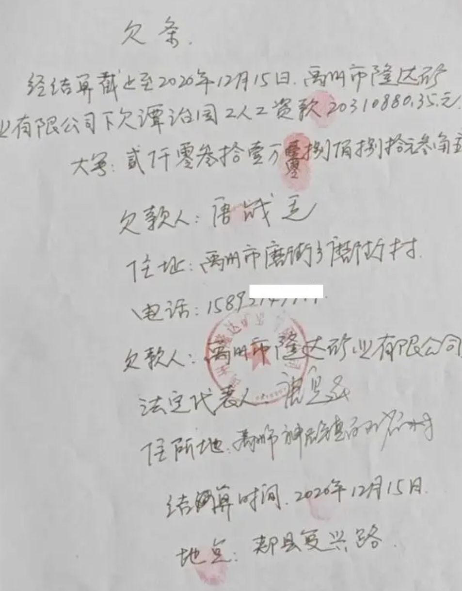 2020年12月15日,隆达矿业公司和实际控制人唐战廷签订结算协议并出具欠条,法人唐魁签字盖章确认2020年1月1日至12月25日,隆达矿业公司欠谭治国工人工资款达2031万零883.5元。