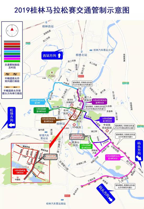 2019年桂林国际马拉松赛 定于11月10日(星期日)在我市举行 为确保赛事安全、顺利进行 根据《中华人民共和国道路交通安全法》 第三十九条规定 决定对比赛涉及的道路 采取临时交通管制措施 现通告如下 比赛线路 全程马拉松赛线路 桂林中心广场(起点)→中山中路逆行半幅→南环路全幅→滨江路全幅→凤北路全幅→中山北路顺行半幅→芦笛路全幅→桃花江路全幅→西山路全幅→丽君路全幅→翊武路全幅→解放西路顺行半幅→解放东路顺行半幅→自由路顺行半幅→穿山路顺行半幅→龙隐桥顺行半幅→龙隐路全幅→七星路(辅星路路口至三里店路口)全幅→七星路(三里店路口至桂磨东二环路口)顺行半幅→七里店路顺行半幅→铁山路顺行半幅→黄桐路顺行半幅→万福东路顺行半幅(折返线路在同侧)→黄桐路逆行半幅→七里店路逆行半幅→环城南一路逆行半幅(到净瓶山桥东头折返后在另一侧逆行半幅)→穿山东路全幅→体育中心(终点)。 ![]() 半程马拉松赛线路桂林中心广场(起点)→中山中路逆行半幅→南环路全幅→滨江路全幅→凤北路全幅→中山北路顺行半幅→芦笛路全幅→桃花江路全幅→西山路全幅→丽君路全幅→翊武路全幅→解放西路顺行半幅→解放东路顺行半幅→自由路顺行半幅→穿山路顺行半幅→龙隐桥顺行半幅→龙隐路全幅→七星路(辅星路路口至三里店路口)全幅→七星路(三里店路口至五里店路路口)顺行半幅→五里店路(七星路路口至骖鸾路路口)全幅→骖鸾路(五里店路路口至兴旺路路口)全幅往返→五里店路(骖鸾路路口至穿山东路路口)全幅→穿山东路全幅→体育中心(终点)。 ![]() 迷你马拉松赛线路 桂林中心广场(起点)→中山中路逆行半幅→南环路全幅→滨江路全幅→凤北路全幅→中华路全幅→靖江王城(终点)。 ![]() 管制事项 (一)11月9日21时起至比赛结束,榕城路、依仁路(中山中路至正阳步行街)、杉湖北路、三多路、榕荫路北段、湖光路、府后里、八桂路、府东里(八桂大厦后巷)、毅峰路、五里店路禁止车辆停放。 (二)11月9日22时起,中山中路(十字街至文明路口)东侧禁止车辆通行,预计11月10日12时解除交通管制。 (三)11月9日22时起,穿山东路(毅峰路路口至空明西路路口)禁止车辆通行,预计11月10日17时解除交通管制。 (四)11月10日6时起,中山中路(十字街至文明路口)西侧、解放西路南侧、榕城路、依仁路(中山中路至正阳步行街)、杉湖北路、三多路、榕荫路、湖光路、府后里、八桂路、府东里(八桂大厦后巷)、文化宫路禁止车辆通行,预计10时30分解除交通管制。 (五)11月10日7时30分起,中山中路(文明路口至南门桥路口)、南环路(南门桥路口至文昌桥路口)、滨江路、凤北路、中山北路(凤北路路口至芦笛路路口)东侧机动车道、芦笛路、桃花江路实施交通管制。 解除管制时间: 1、滨江路(解放桥西头南匝至凤北路路口)、凤北路、中山北路(凤北路路口至芦笛路路口)东侧机动车道预计9时10分解除交通管制。 2、芦笛路、桃花江路预计10时解除交通管制。 3、中山中路(文明路口至南门桥路口)、南环路(南门桥路口至文昌桥路口)、滨江路(文昌桥路口至解放桥西头南匝)预计10时30分解除交通管制。 (六)11月10日8时起,西山路、丽君路、丽泽桥、翊武路、解放东路南侧机动车道、解放桥南侧机动车道、自由路(解放桥至穿山路路口)南侧机动车道、穿山路(自由路路口至龙隐桥西头)、龙隐桥、龙隐路、七星路(辅星路路口至三里店路口)、七星路(三里店路口至桂磨东二环路口)西侧机动车道、五里店路(七星路路口至穿山东路路口)、骖鸾路(五里店路路口至兴旺路路口)、穿山东路(空明西路路口至五里店路路口)实施交通管制。 解除管制时间: 1、西山路、丽君路、丽泽桥、翊武路、解放西路南侧机动车道、解放东路南侧机动车道、解放桥南侧机动车道、自由路(解放桥至穿山路路口)南侧机动车道预计10时30分解除交通管制。 2、穿山路(自由路路口至龙隐桥西头)、龙隐桥、龙隐路、七星路(辅星路路口至三里店路口)、七星路(三里店路口至桂磨东二环路口)西侧机动车道、五里店路(七星路路口至穿山东路路口)、骖鸾路(五里店路路口至兴旺路路口)预计11时20分解除交通管制。 3、穿山东路(空明西路路口至五里店路路口)预计14时30分解除交通管制。 (七)11月10日8时30分起,七里店路西侧机动车道、铁山路(横塘路路口至黄桐路路口)西侧机动车道、黄桐路北侧机动车道、龙门大桥北侧机动车道、万福东路北侧机动车道、环城南一路、穿山东路 (五里店路路口至环城南一路路口) 实施交通管制,预计14时30分解除交通管制。 管制期间,七里店路东侧机动车道、铁山路(横塘路路口至黄桐路路口)东侧机动车道、黄桐路南侧机动车道、龙门大桥南侧机动车道、万福东路南侧机动车道允许机动车辆双向行驶,但黄牌货车、低速载货汽车、三轮汽车、拖拉机禁止通行。 点击可看大图▼ ![]() 管制要求 (一)11月10日比赛期间,赛道两侧道路禁止堆放各类物品(含人行道、路内停车泊位、非机动车道、辅道)。 (二)公交、公路客运和旅游客运企业请根据本通告规定,提前调整车辆运营时间和线路。受交通管制影响的有关单位、居民和游客,请自行调整生产运输和出行安排,合理规划行程。(三)管制期间,公安机关将根据现场活动情况提前或推迟交通管制时