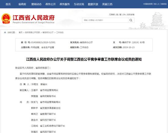 江西省人民政府办公厅关于调整江西省公平竞争审查工作联席会议成员的通知 ![]() 各设区市人民政府,省政府各部门: 鉴于机构改革和职能调整,由省市场监管局承担组织实施公平竞争审查制度职能。经省政府研究,决定对江西省公平竞争审查工作联席会议成员进行调整。现将调整后的联席会议成员名单通知如下: 召集人: 孙菊生副省长 副召集人: 王福平省市场监管局局长 樊雅强省政府副秘书长 成员: 张龙飞省市场监管局副局长 郭新宇省发展改革委副主任 裴鸿卫省教育厅副厅长 谢金水省科技厅副厅长 江明成省工业和信息化厅副厅长 张福庆省民政厅副厅长 刘晨华省司法厅二级巡视员 张耀霞省财政厅副厅长 刘克琦省人力资源社会保障厅副厅长 陈祥云省自然资源厅副厅长 石晶省生态环境厅一级巡视员 熊春华省住房城乡建设厅副厅长 胡钊芳省交通运输厅总工程师 蔡勇省水利厅副厅长 邓贤贵省农业农村厅副厅长 宁小武省商务厅二级巡视员 丁新权省文化和旅游厅副厅长 江晓斌省卫生健康委副主任 卢正大省国资委副主任 严成省林业局副局长 许忠华省金融监管局副局长 兰丽华省广电局副局长 刘福元省粮食和储备局副局长 刘小俊省药监局二级巡视员 温亚涌省税务局副局长 吴豪声人行南昌中心支行副行长 曾晖江西银保监局副局长 周军江西证监局副局长 办公室设在省市场监管局,张龙飞兼任办公室主任。 2019年10月23日 |